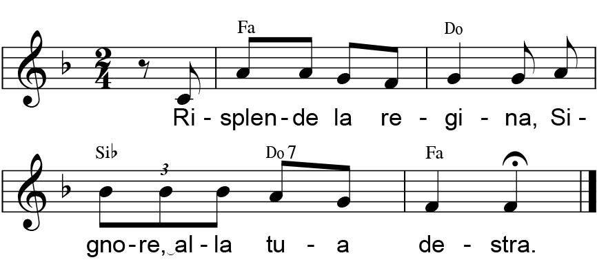 PROPOSTE PER I CANTI: da Nella casa del Padre, ElleDiCi, 5a ed. - Inizio: Acqua di fonte cristallina (21); Lieta armonia (581). Salmo responsoriale: M° S. Militello; oppure: Ave, Maria (399). Processione offertoriale: Dov'è carità e amore (639). Comunione: Beata sei tu, Maria (574); Madre del Salvatore (584). Congedo: Vergine del silenzio (595).